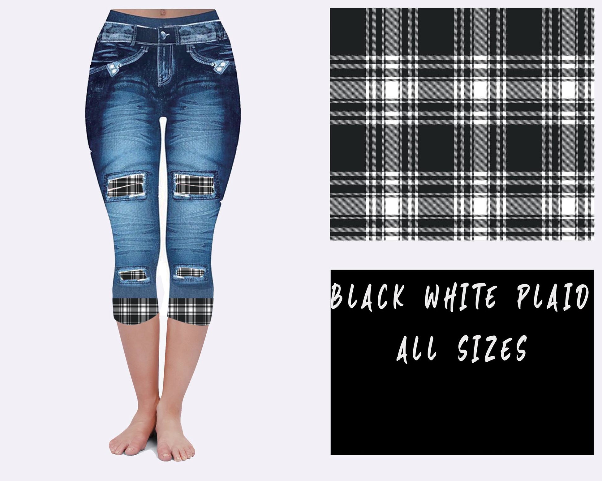 Black & White Plaid Blue Faux Denim Capri Leggings with Back Pockets (GC)