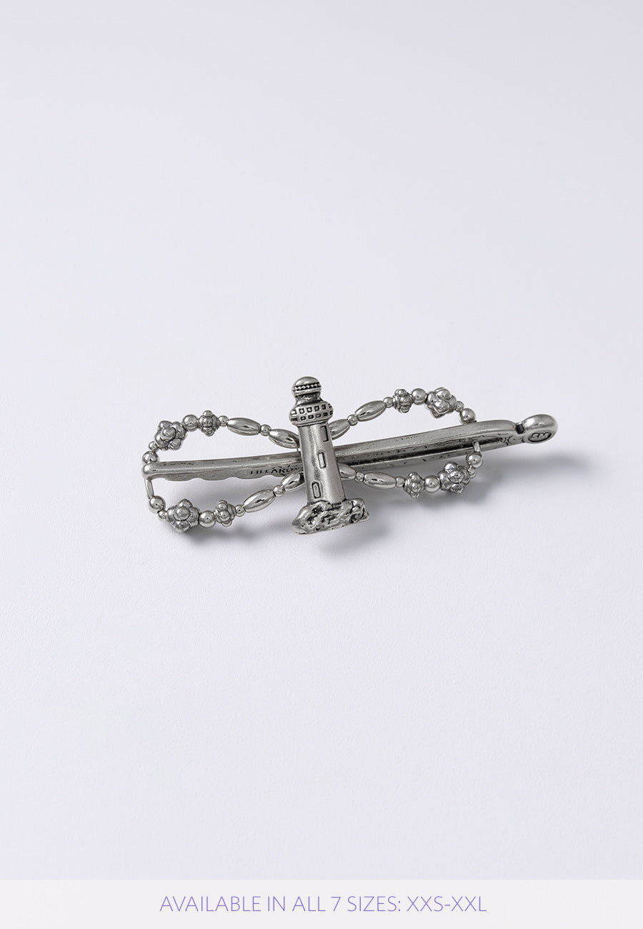 Lighthouse gleams in silvertone.